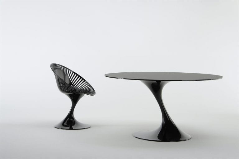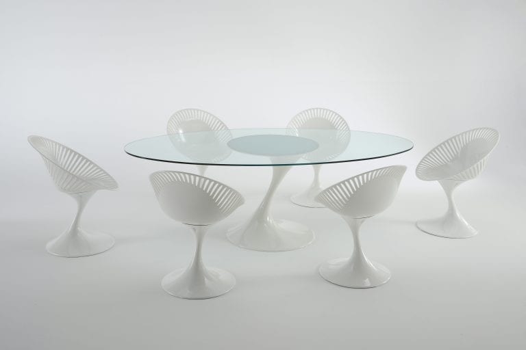 The sweeping twist formed by the base is perfectly balanced for hosting a large family gathering or a quiet breakfast for one, offering generous seating for up to six. Designer Marcello Ziliani created a set of dining chairs out of fiberglass that match the lighthearted and contemporary sweep of the table to complete the chic look.
