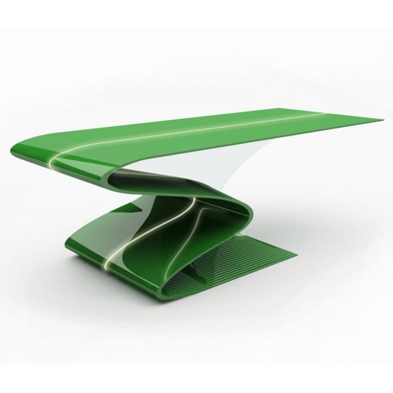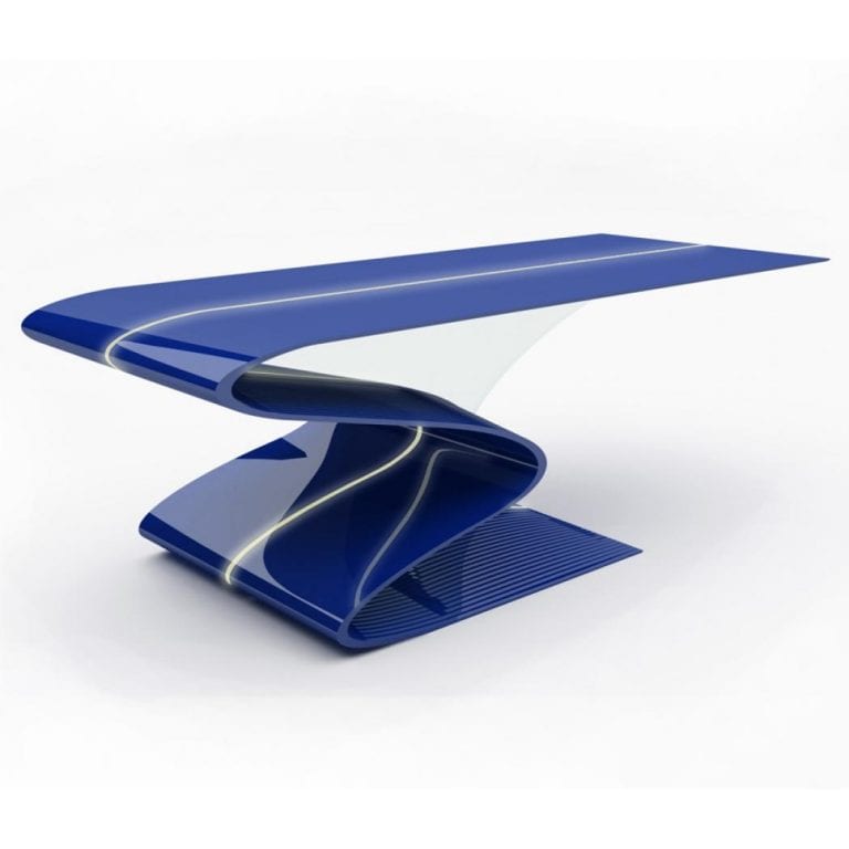 The Cobra Table by Pierre Cardin Studio is crafted into its sinuous shape with high-gloss lacquered wood and Plexiglas. To highlight — literally — the sweeping S-curves of the design, a strip of LED lights illuminates the form of the counterbalanced table, which only uses one leg for support. The result is a smooth, uninterrupted line with a hint of sensual fluidity like a liquid form being poured from a glass.