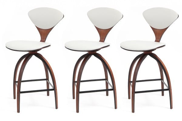These Norman Cherner bar stools are made by the sons of the furniture famous designer. Owning the production rights to the original designs, the sons started manufacturing many of his mid century classic chairs, tables, and stools to meet modern demand. The original techniques are still employed where layers of laminate are stacked on top of one another and then shaped into the form of the chair, table, or stool. Available in the following colors: beech, walnut, ebony, orange, white, and walnut seat with ebony base. This picture displays three white backed and bottom examples. Throwing in a bit of modern into a home design can do wonders for updating its decorative look. The kitchen is a great area to do this in even if the majority of your home is more traditional or classical in nature.