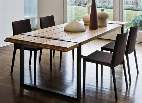 The Raw Dinner Table is a very simple and efficient dinner table design. We’re looking at a simple steel framework that sustains five planks of solid aged oak and, voila, that’s your Raw Dinner Table. So how can the Raw change shapes whenever you please? Well those five planks of solid wood we mentioned before are not locked down in a fixed position. You can move them around in order to create an irregular, yet still very solid, dinner table that will inspire and impress all your future guests. The Dinner Table is available from Zanotta, so that’s where you’d have to order your next dinner table from.