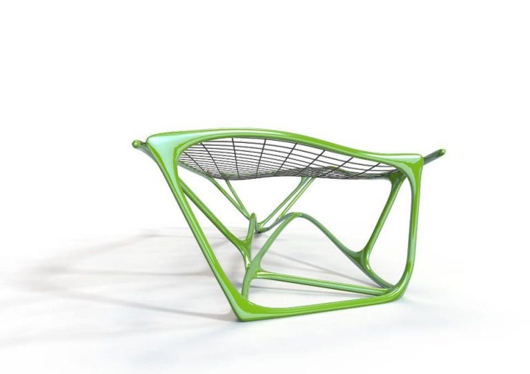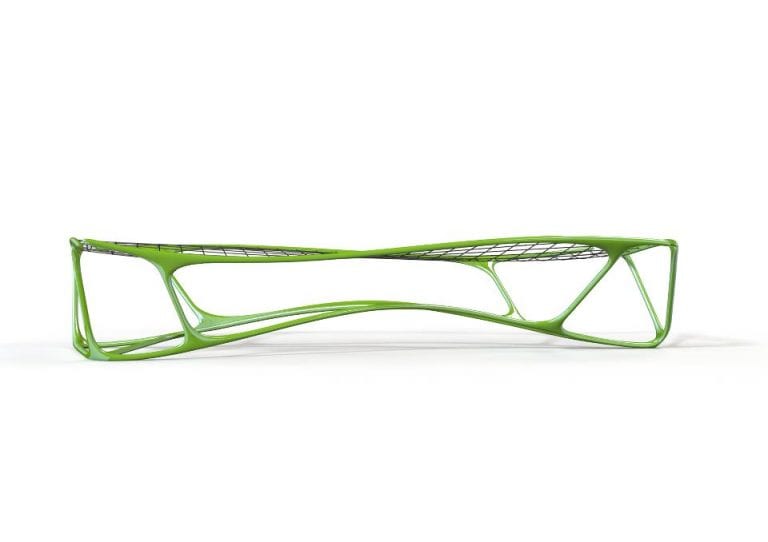The Weave bench by Peter Donders, crafted out of cast aluminum and carbon fiber reinforced with steel wires, is a fluid, free-flowing design that is further enhanced by the seat resembling a widely spaced steel mesh.