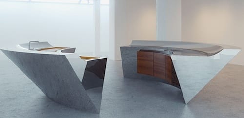 The “Tipping Point” re-imagines the modern kitchen and is nothing short of a stunning sculpture. It highlights includes the mirror-polished stainless steel surface which contrasts beautifully with the warmth of walnut cabinetry. The dichotomy of two opposing materials makes it stand apart from the rest of the clique. With the curved “Tipsy”, Splinter Works reinterprets the mini-bar by using carbon fiber as primary material and going the non-linear route. Then there is the “Dime Two” which is a semi-circular blade of rosewood mounted on wall and gives an illusion of it floating in air. Made from carbon fiber, Santos rosewood veneer and silver leaf, only 24 pieces of Dime Two will be available.