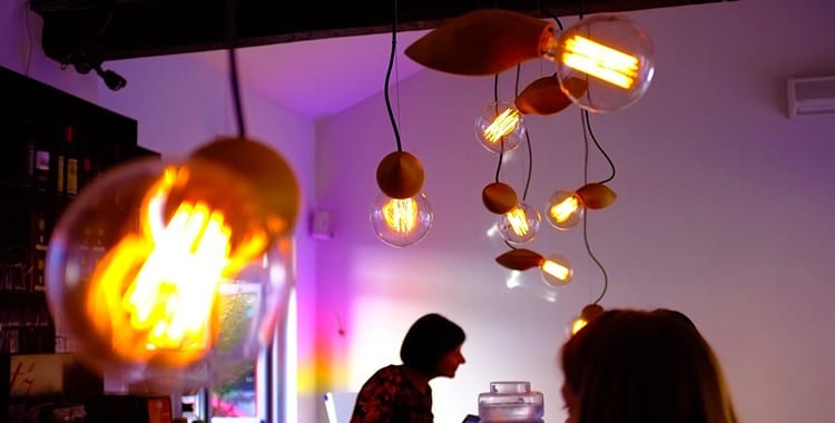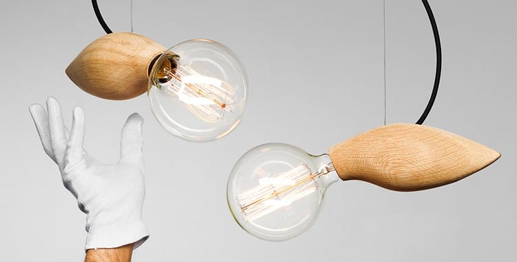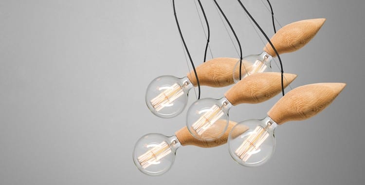 Special Bulbrite bulbs are connected to custom-made wood pieces to showcase superior Scandinavian design. When lit, the bulbs reveal patterns of tangled filaments.