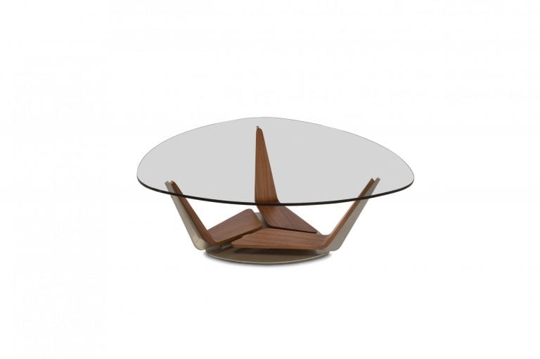 Triplex gets its name from the table with three sleek upturned arms which blend beautifully in a unique triangular symmetry. A dramatic visual point is created by the gap between the three elements. The arms are made of rich walnut veneer and boast taut forms. They provide a striking display and separate at the top to support the glass tabletop.