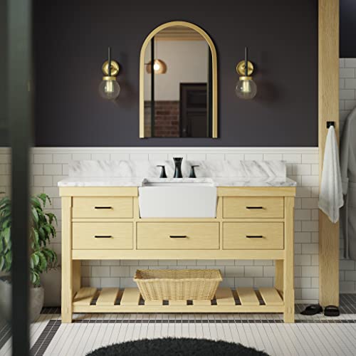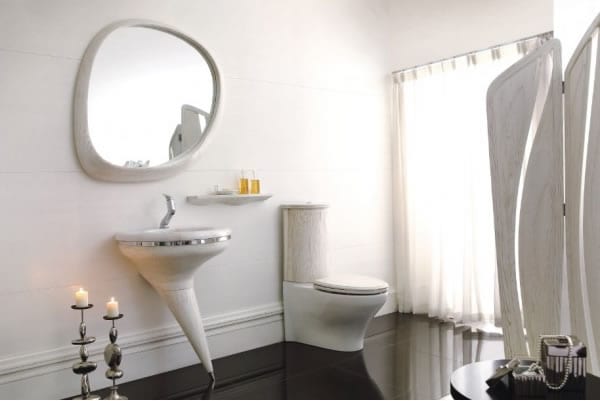 The Isabella Pedestal Vanity Set is a fresh take on bathroom vanities. It is comprised of a sink, mirror, and stool. The mirror and sink are irregularly shaped while the stool has handles on its sides. The pieces are made of solid ash wood and have a water resistant finish.