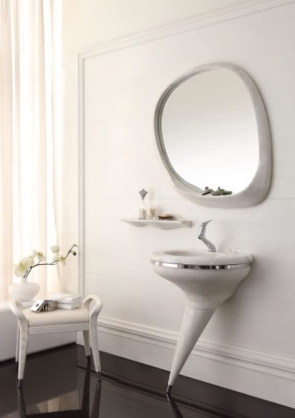 The sinks are sold as a set of two or as separate left and right pieces. They have marble tops and are supported by pointed pedestals that look more like sharpened pencils than sink supports. The pedestals slant to one side creating a look that is simply unmatched. Isabella is the perfect solution to bathrooms limited for space. Its neutral color is ideal for minimalist homes.