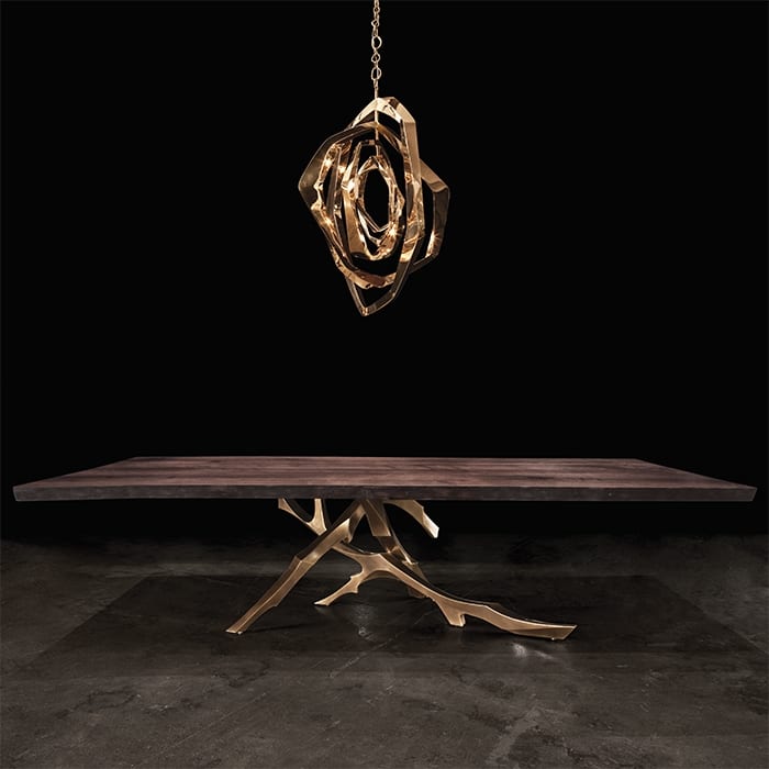 Furniture maker Hudson Furniture has created an organic wood table that is the essence of its specialties woodwork and custom design. Grolier is one of a kind; it has a base that showcases the natural knots of wood, twigs, smooth curves, and cracks created by the elements.
