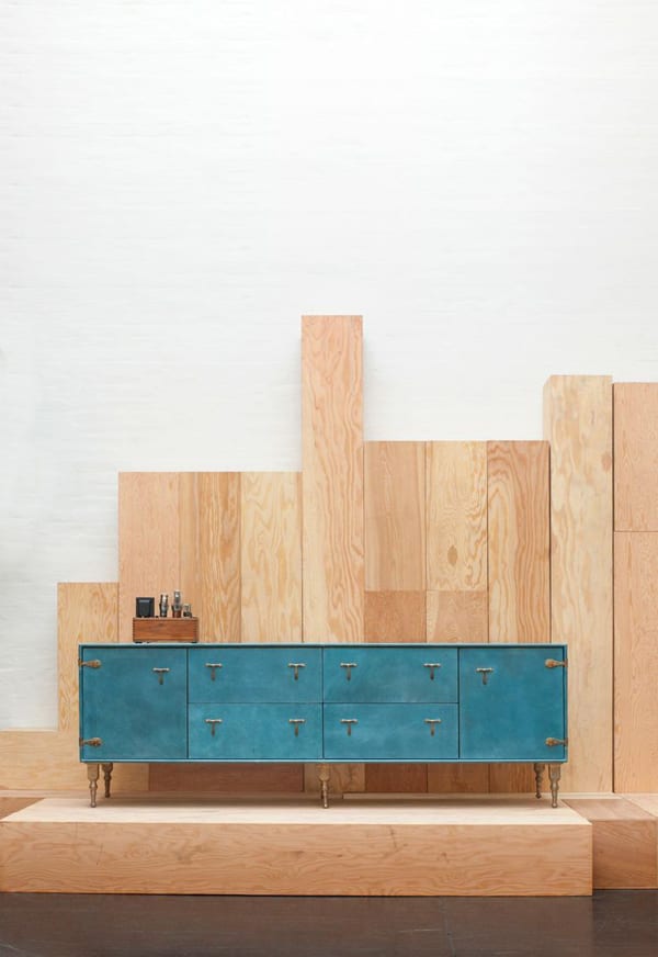 What a beauty! These leather credenzas are truly a statement piece for any room. They have a presence that demands a second look. They can come in several finishes. They can also be made with a varying number of drawers based on the needs and wants of the buyer. The image below features a stunning aqua leather and bronze hardware.